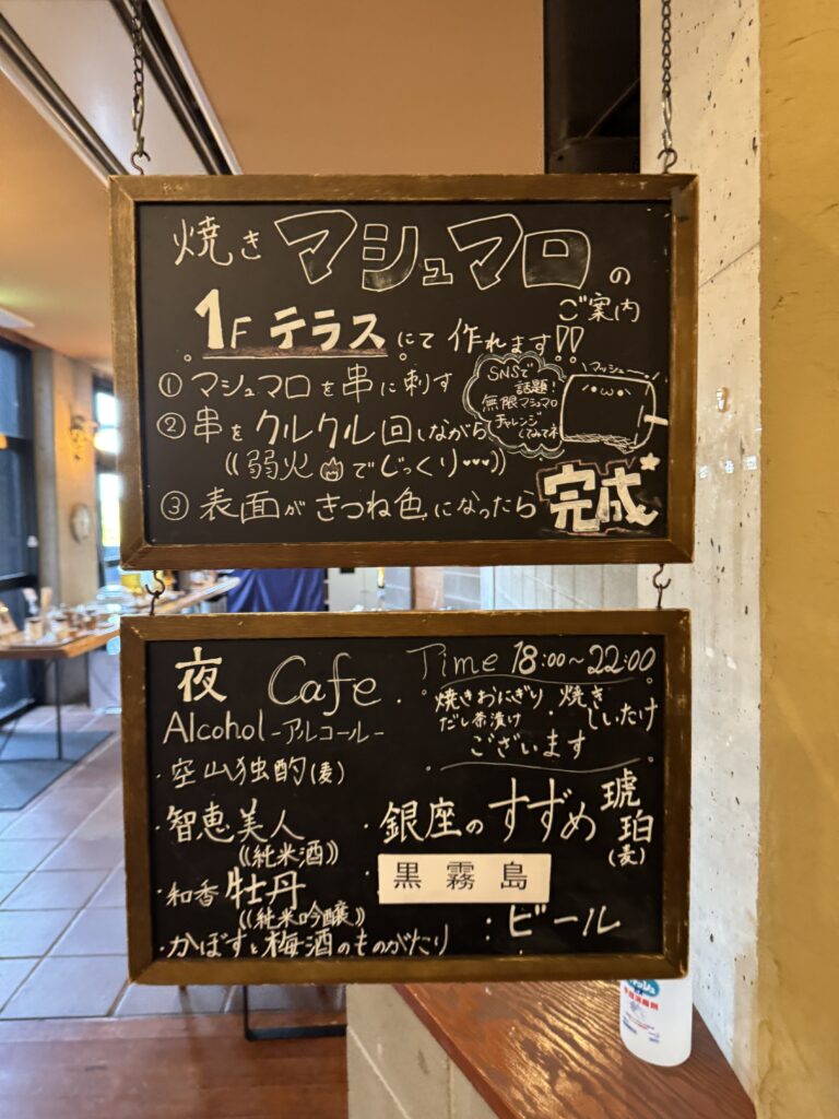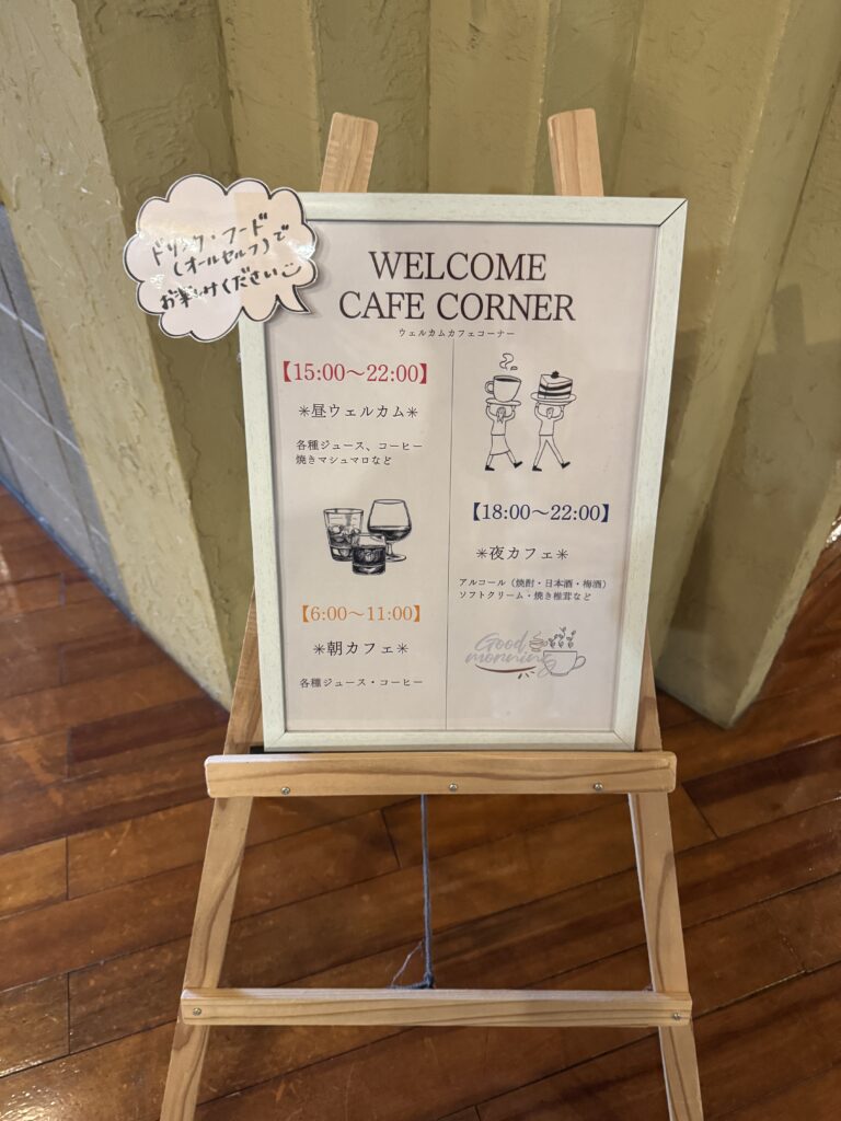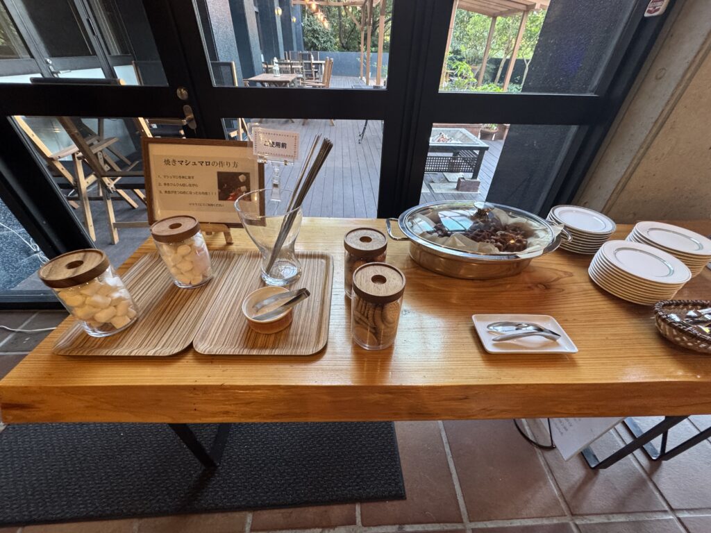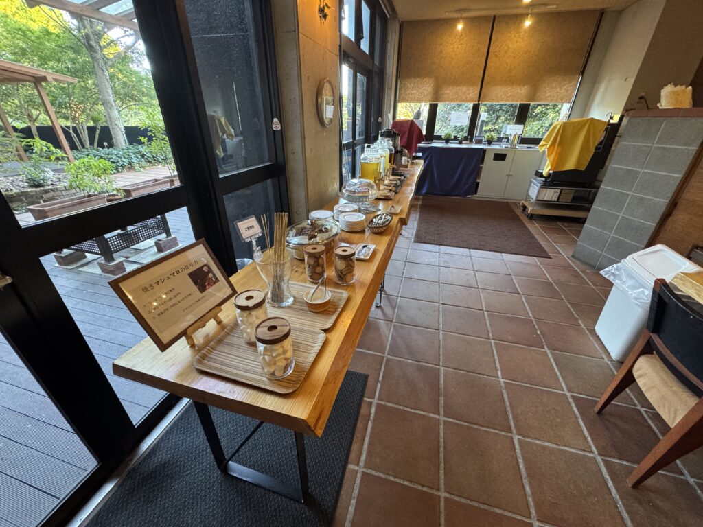 • お酒はありませんが、コーヒー・ジュースに加え、ケーキやマシュマロが食べ放題。