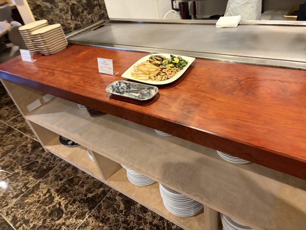 オープンキッチンで提供されるのが、一人一枚ずつの「牛ステーキ」と「アワビ」。 ビュッフェのオマケのような質ではなく、柔らかくて旨味たっぷり。これだけでも元が取れそうなクオリティです。