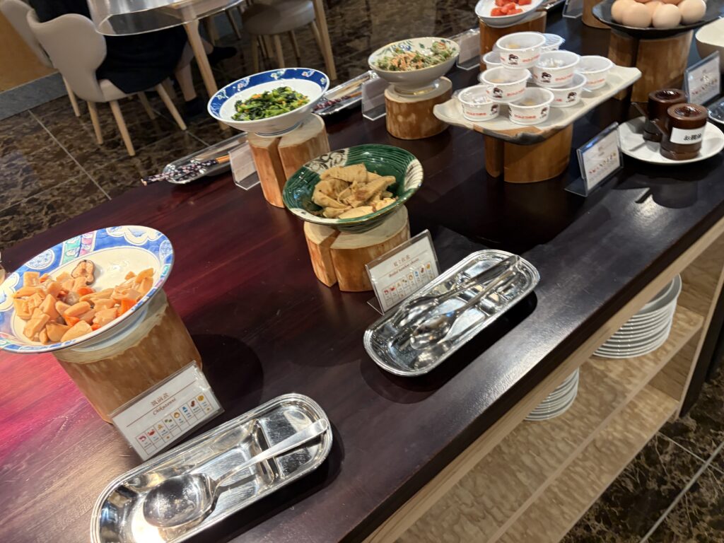 朝食もモーニングビュッフェスタイルです。 目の前で焼いてくれる「オープンキッチンのオムレツ」や、大分名物「とり天」、味が染みた「肉じゃが」など、和洋のメニューがずらり。 フルーツも新鮮で、朝から家族全員お腹いっぱいになりました。