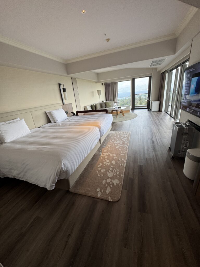 角部屋ならではの大きな窓からは、沖縄の海が一望できます。窓際には大きなデイベッドがあり、ここが子供たちの格好の遊び場&お昼寝スペースに。 ベッドもハリウッドツイン(2台くっついている)対応が可能で、添い寝も安心でした。