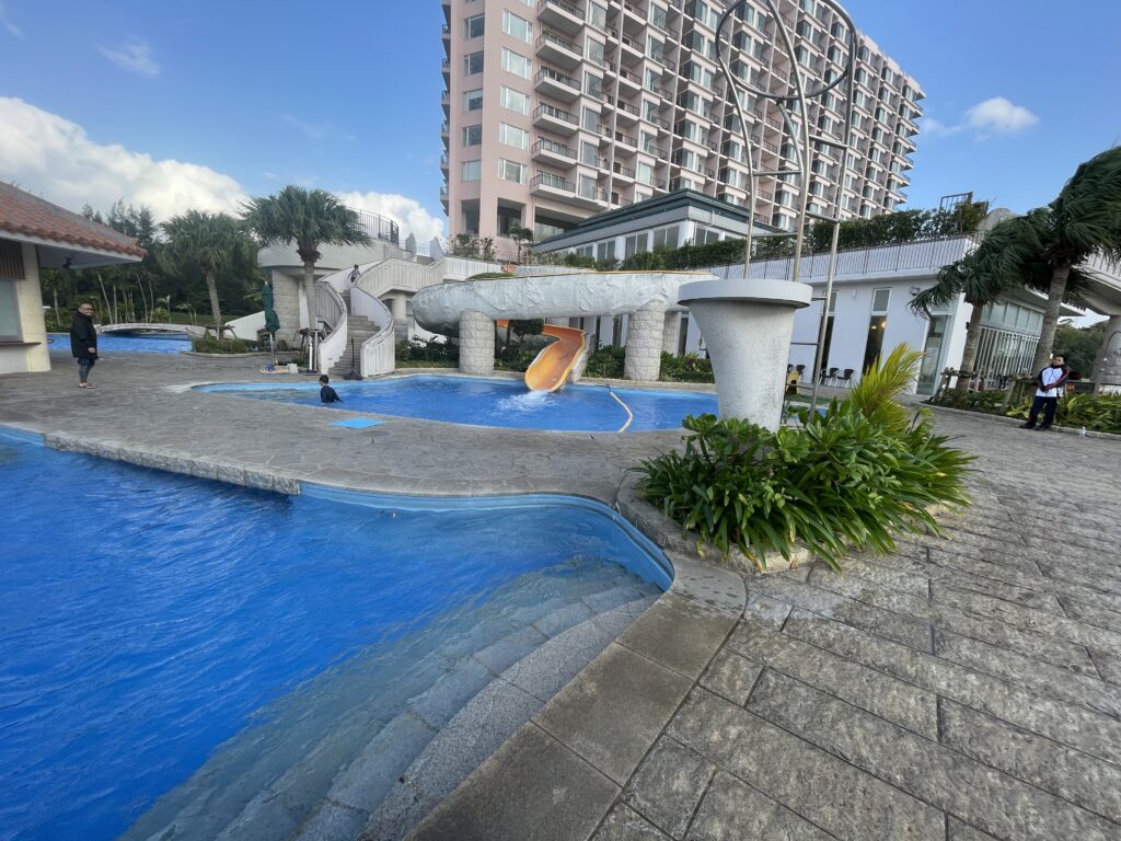 てっきり冬は屋内プールしか使えないと思っていたのですが、ここのガーデンプールは一部が温水仕様になっていました。 12月上旬の沖縄はまだ暖かい日もあり、温水エリアなら寒さを感じずに快適に遊べます。