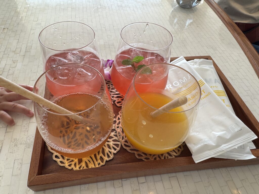 アルコール入りのアセロラ?とノンアルコールから選べます。もちろん、子供用のリンゴジュースやパイナップルジュースもすぐに用意してくださる神対応。この時点で「ここにして良かった…」と確信しました。