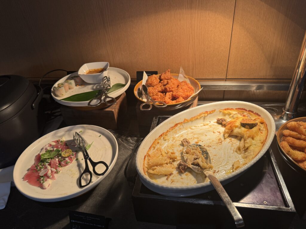 そこには、**カレー、グラタン、唐揚げ、ハンバーグ、シュウマイ、カルパッチョ、生ハム、サンドイッチ、そして大量のデザート(ケーキ、フルーツ)**が並ぶ、豪華ビュッフェが広がっていたのです。