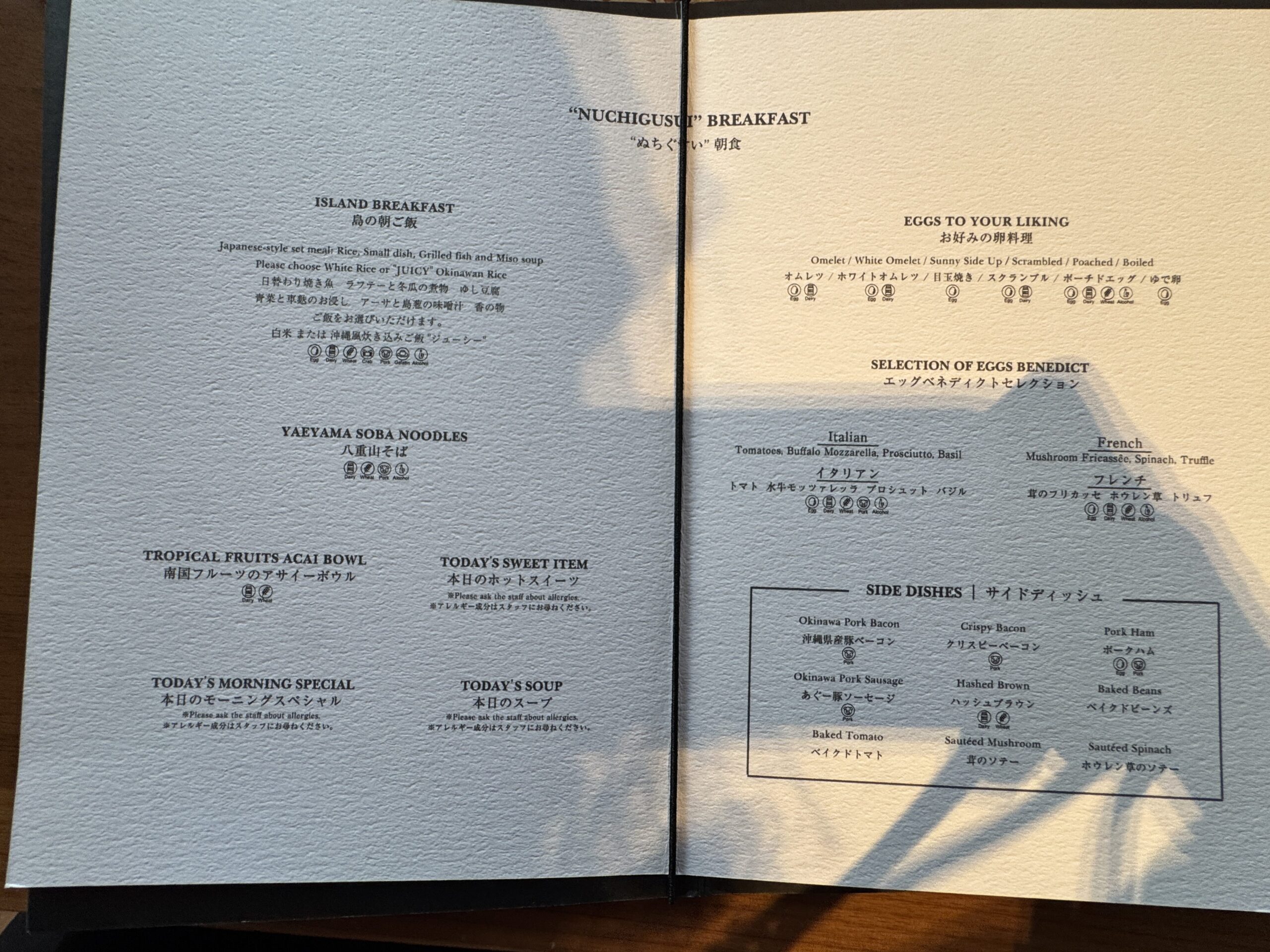 - これがメイン!「島の朝ご飯(和定食)」「八重山そば」「エッグベネディクト」「オムレツ」「アサイーボウル」など、温かい出来立ての料理を、席まで運んできてくれるのです。