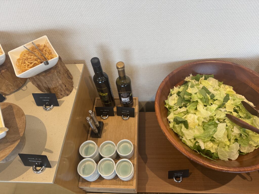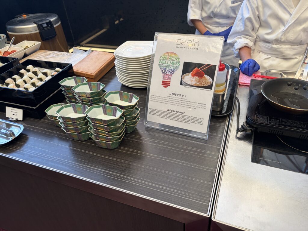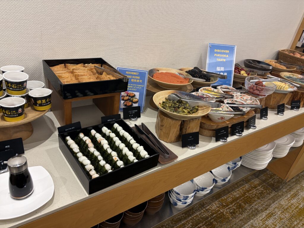 翌朝は、まず6:30オープンのラウンジへ。 一口サイズのおにぎり、稲荷寿司、サラダ、スクランブルエッグなどが用意されており、静かな空間で軽く済ませたい方にはこちらがおすすめです。