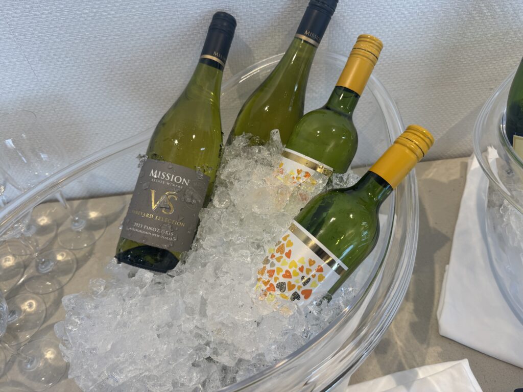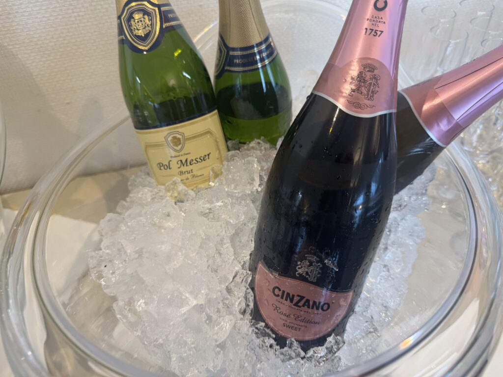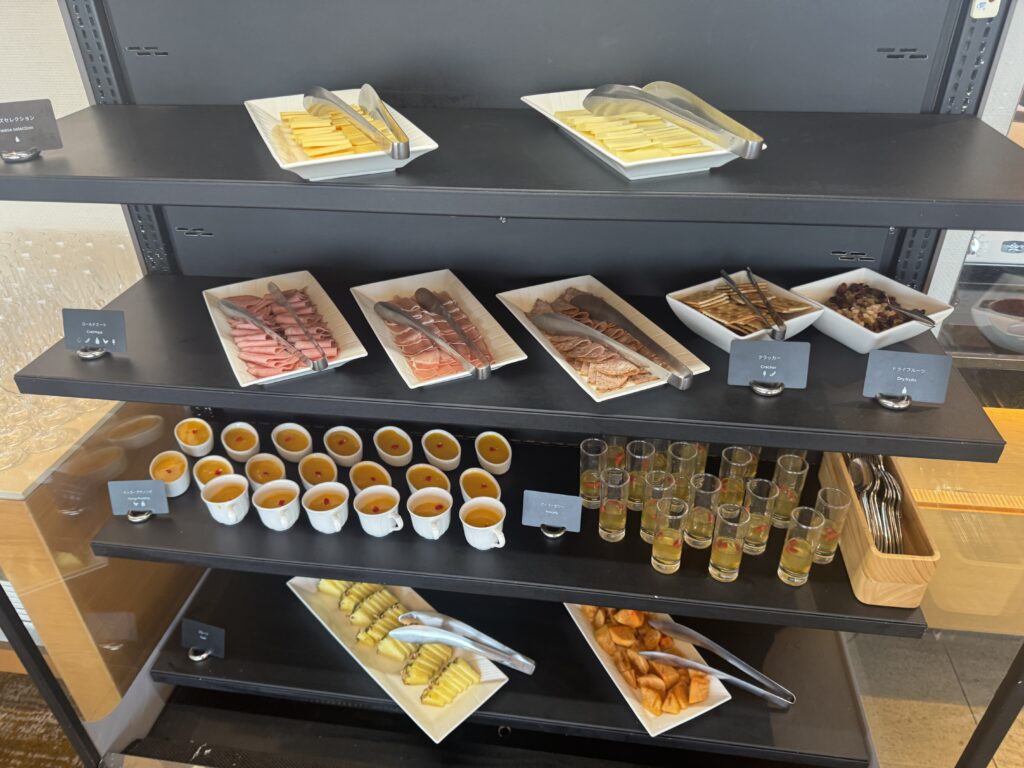 - カクテルタイム(17:00〜) この日は混雑のため1時間制でしたが、アルコール類はスパークリングワイン2種類、ビール、焼酎など充実。 フードはサラダ、ハム、シューマイ、フライドポテト、パンなどが並んでいました。 夕食代わりにするには少し物足りない量ですが、お酒のおつまみとしては十分楽しめます。