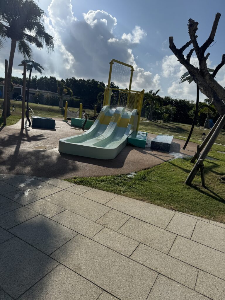 こちらが1歳・2歳児に天国でした。 浅いキッズプールに、小さな滑り台や水が噴き出す遊具が併設されています。