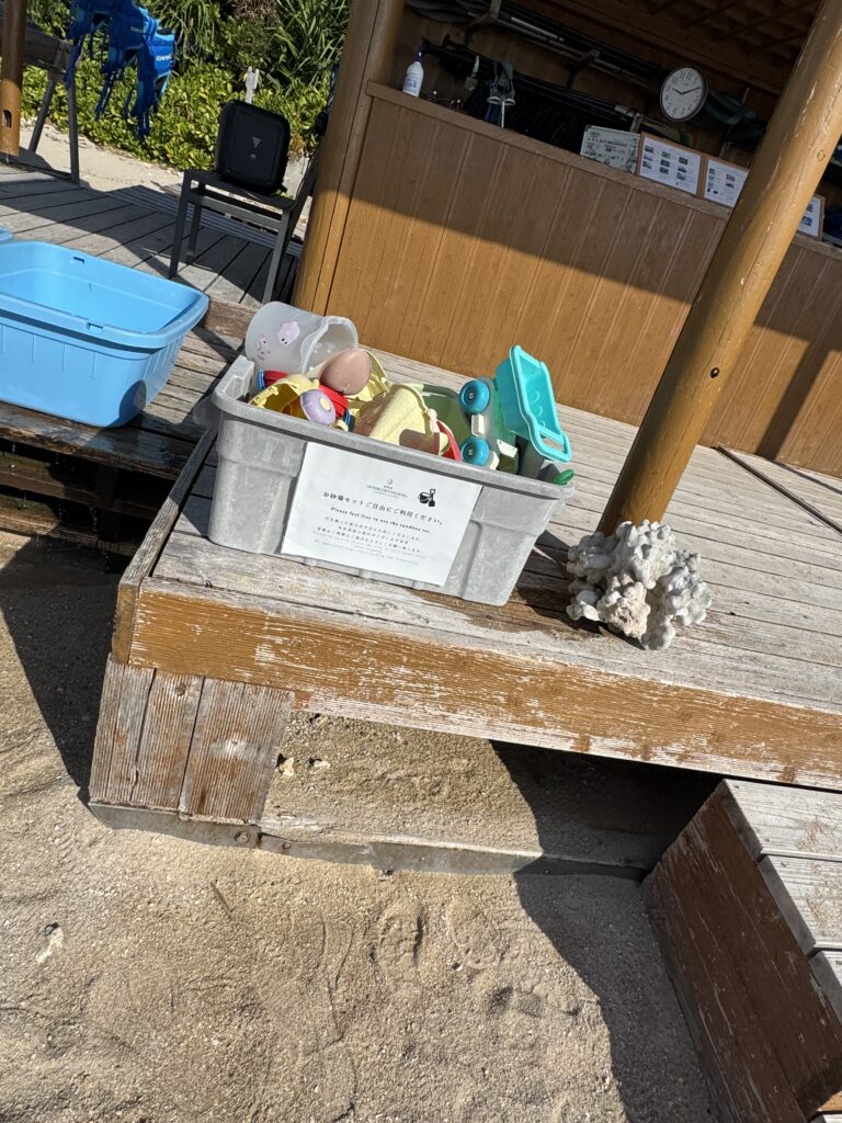 これが本当に助かりました!砂場セットはかさばるので、持ってこなくて良いのは大きなメリット。1歳・2歳の子供たちは夢中で砂遊びを楽しんでいました。 追加料金を払えば、海に浮かぶ巨大なアスレチック(マエサトオーシャンパーク)も利用できるようです。