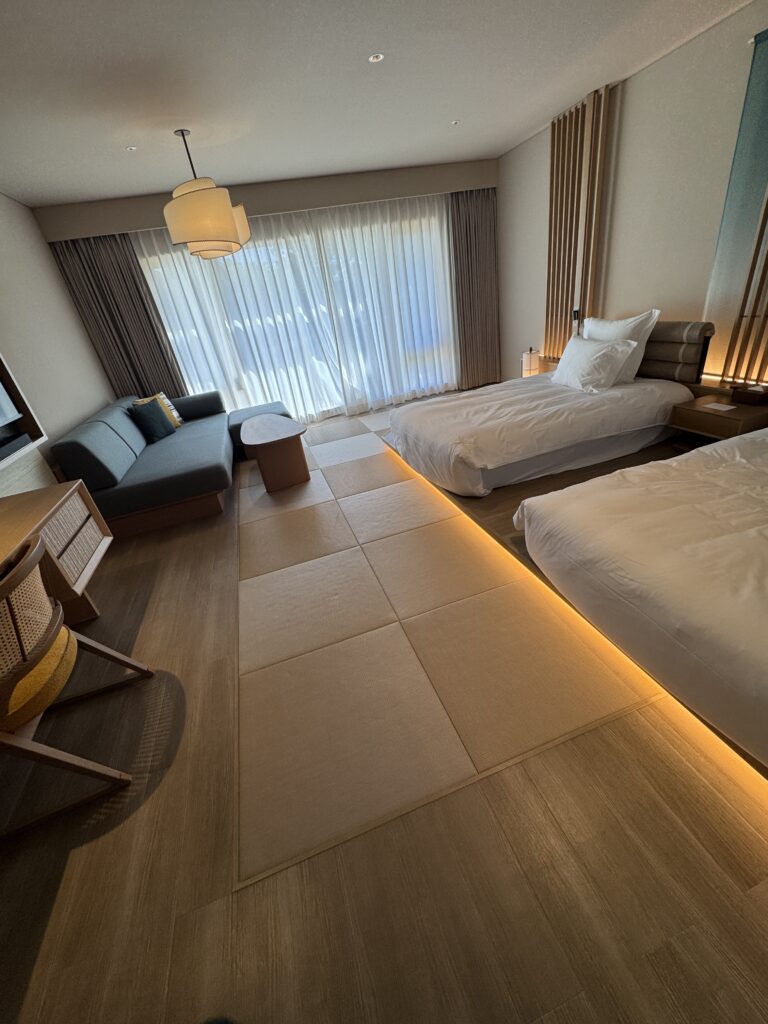 クラブルームのベッドは高さがあり、子供が寝ている間に落ちないかヒヤヒヤしました(ベッドガードは借りましたが)。 しかし、コーラルツインは玄関で靴を脱ぎ、琉球畳のスペースにマットレスが置かれたようなスタイル。