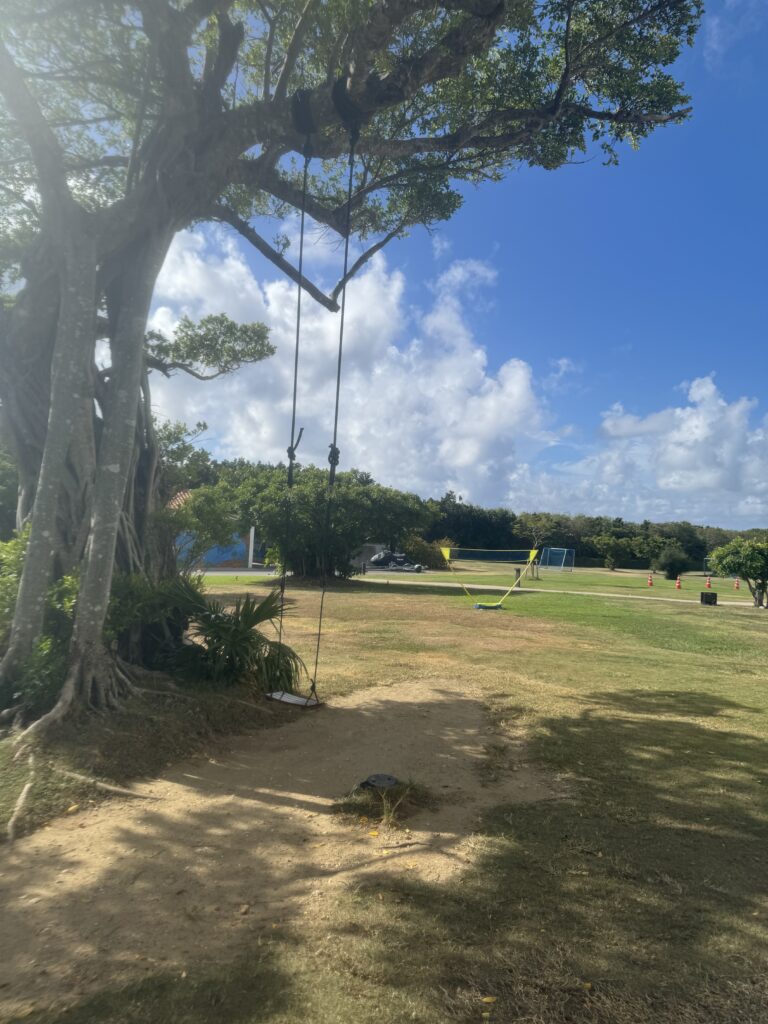 プールや海だけでなく、中庭やプールサイドも子供の遊び場。 サッカーボールやバドミントンのラケット・シャトル、大きなブランコなどが自由に使えるように置かれています。