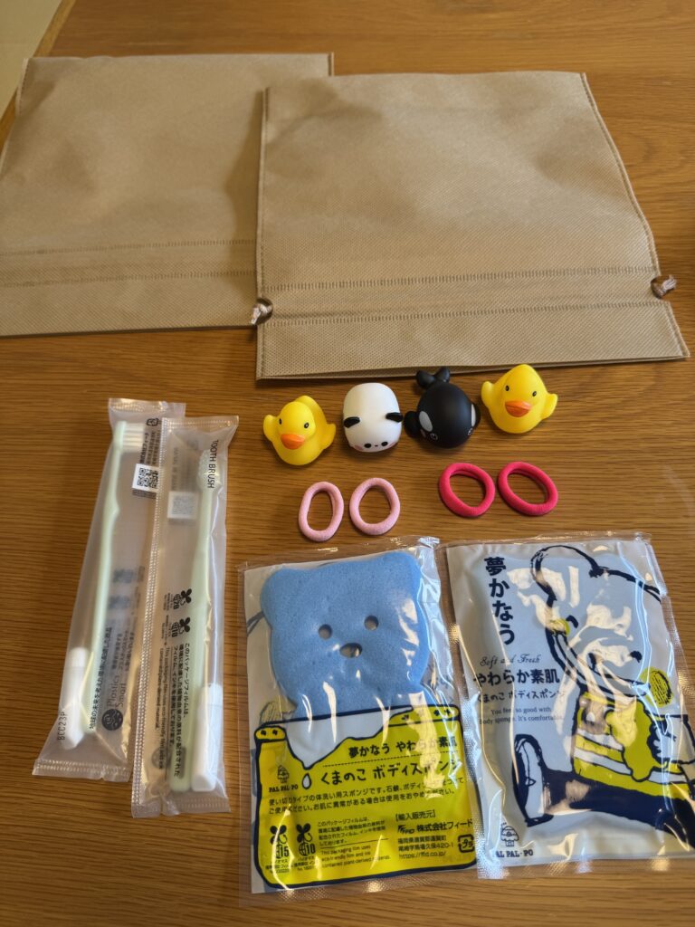 お部屋に入ると、子供用の小さなアメニティセットが。 中には子供用の歯ブラシと一緒に、可愛らしい小さなおもちゃが入っていました! このちょっとしたサプライズに子供たちは大喜び。長距離移動の疲れも吹き飛んだようでした。