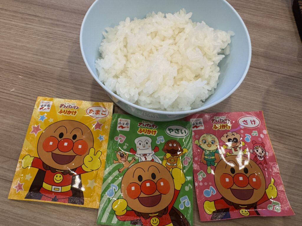 そして運ばれてきたのは、炊き立ての白ご飯と、みんな大好きアンパンマンのふりかけ! このお心遣いには本当に感激しました。おかげで子供たちもご機嫌で、私たち夫婦もゆっくりと食事を楽しむことができました。